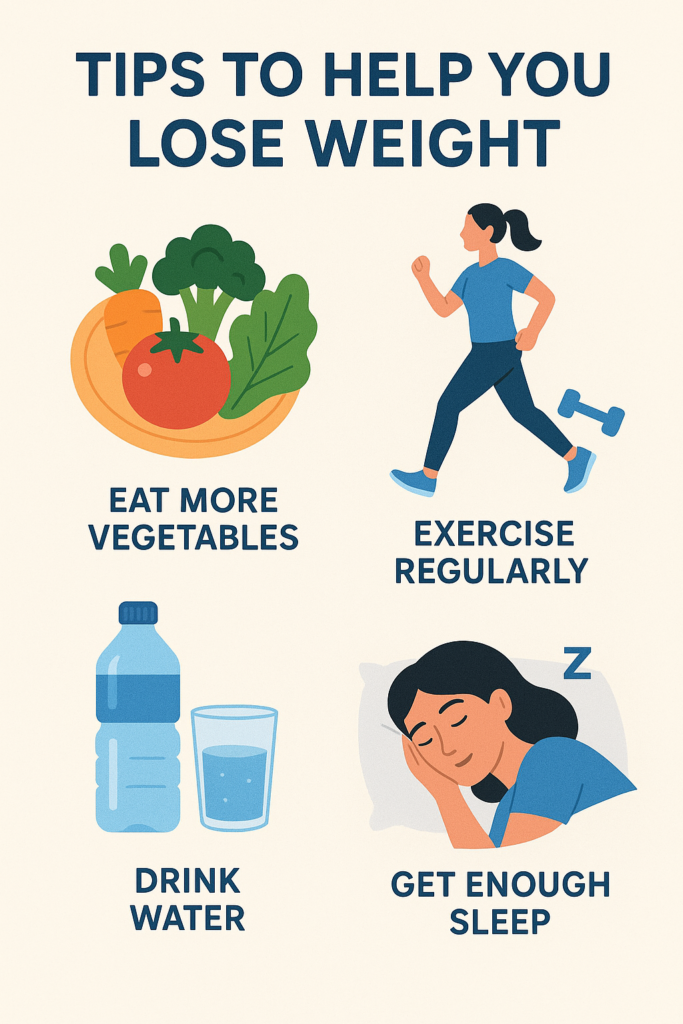 Set realistic goals: Aim to lose 0.5–1 kg (1–2 lbs) per week.